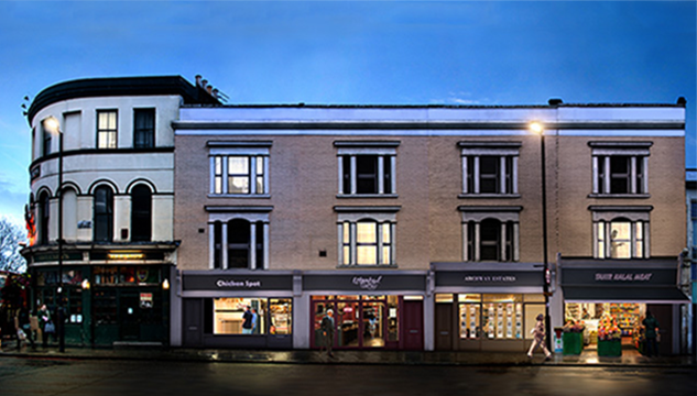 The block of properties located at 3 to 9 Junction Rd occupy a key and highly visible site opposite Archway underground station, at which more than 8 million passengers enter and exit each year. Sited at the top of Junction Road, adjacent to the Archway gyratory, forming the most significant of the shopfront projects being undertaken by the practice.