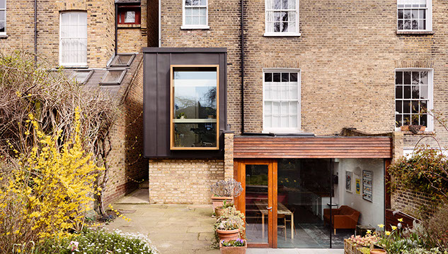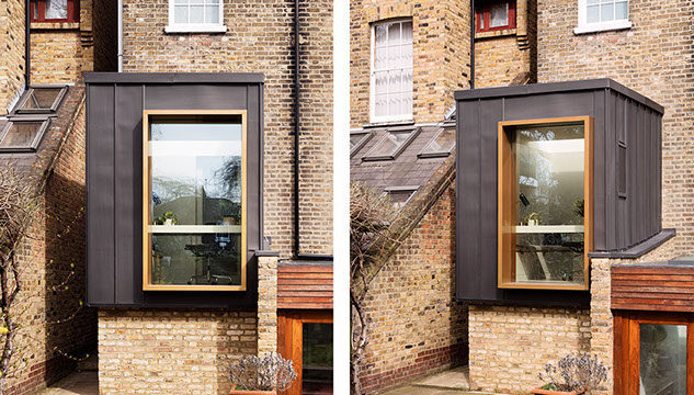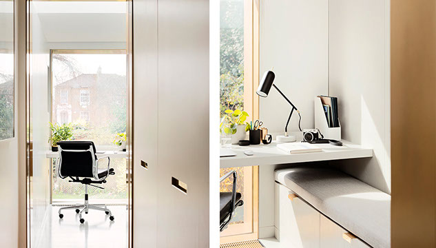 The deep-set window provide shading across an integrated desk. The window’s broad reveal is clad in gold powder-coated aluminium, which gleams against the dark zinc and picks out the deeper tones of the yellow London stock brickwork. The study’s pocket-door is also framed in gold. When viewed from the entrance hallway, these golden frames lead the eye through the house and out to the lush garden beyond. Brass ironmongery on interior elements continues the gold metallic theme, giving expression to an optimistic and underused colour. Keeping the window’s clean lines free from hinges and fasteners, the space is ventilated by an idiosyncratic wooden hatch in the side wall.