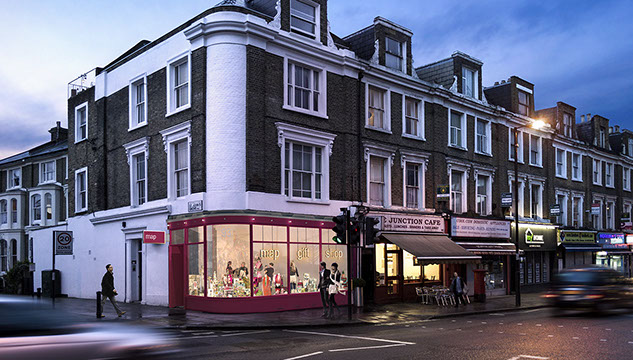 Many of the shop fronts along Junction Road – including the adjacent St. John’s Tavern at number 91 – had external lamps that illuminated the road where street lights were lacking. Prior to redesign, the Map shop held memories of the historic site – a row of fairy lights were fitted to the fascia, echoing the rhythm and scale of butchers’ hooks that once hung in that same location.