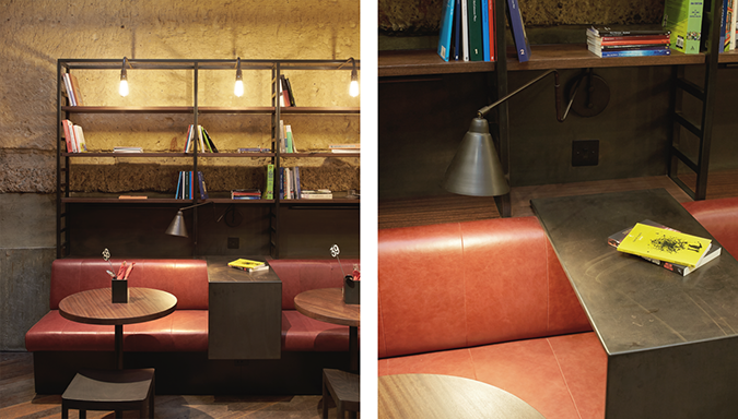 Materials and detailing were carefully developed to complement the existing building. The furniture is designed to look better in five years than on day one. Where possible, materials were salvaged and reused: the old slate bar top was re-employed as benches. And to ensure a personality unique to the Royal Court, all joinery is bespoke – from the custom-made pendant lights to the filigree screens behind booths.