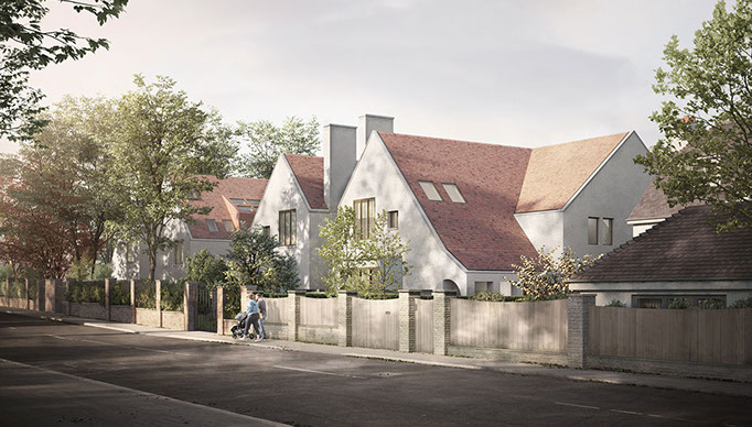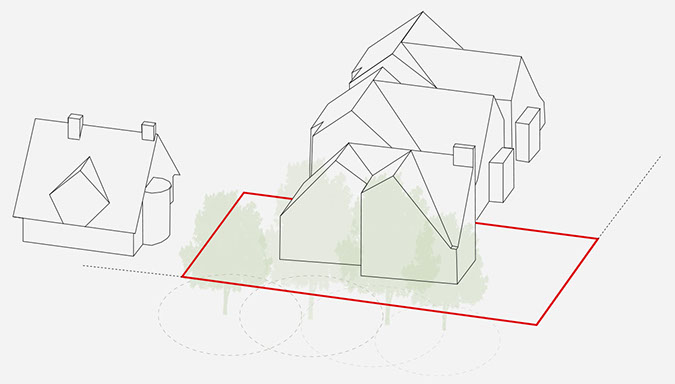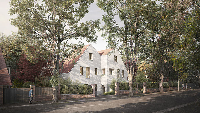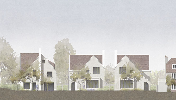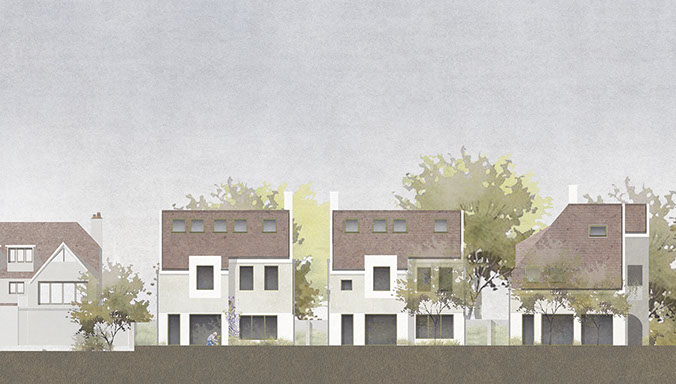 A proposal for three houses on the tree-lined corner of West Heath Avenue. Inspired by the arts and crafts movement, the design responds sensitively to its context, while taking a contemporary approach towards architectural form.
