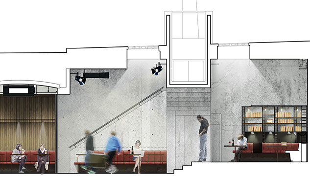 Working alongside the theatre’s Artistic Director Vicky Featherstone, we surveyed use of the undercroft, summarised by the pedestrian-flow diagram (far left). With this complete, a sensitive appraisal of the Grade II-listed building began. This helped the team understand the historic fabric’s construction and materiality, which informed later design decisions.