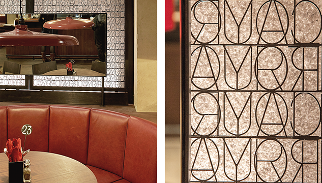 Materials and detailing were carefully developed to complement the existing building. The furniture is designed to look better in five years than on day one. Where possible, materials were salvaged and reused: the old slate bar top was re-employed as benches. And to ensure a personality unique to the Royal Court, all joinery is bespoke – from the custom-made pendant lights to the filigree screens behind booths.