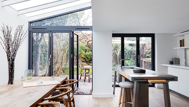 On the ground floor we maximised permeability between the ground floor and rear garden by fitting the kitchen and side-return dining extension with new, aluminium-framed bifold doors.