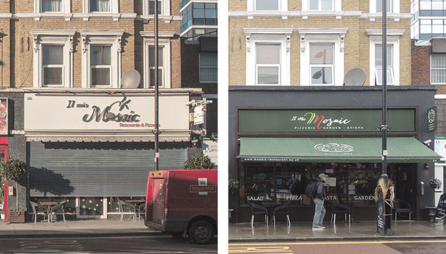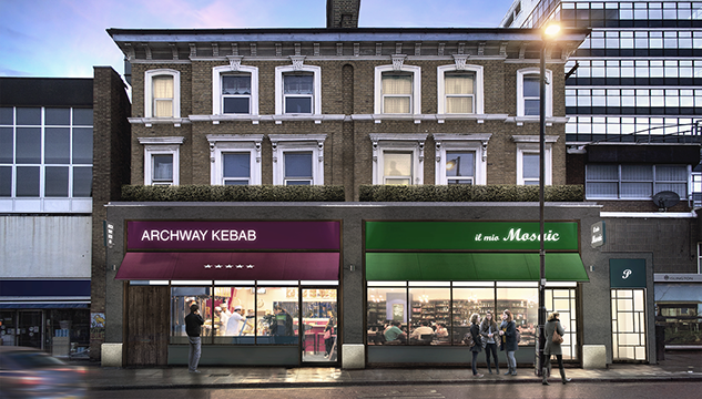 The renovation of Archway Kebabs and Il Mio Mosaic was completed in 2014, two of several independent business revamps to be carried out as part of Islington’s £2 million regeneration scheme. The frontage to the extension was greatly improved, with both shops reporting increases in sales directly related to the improved impression that this had made to their customers.