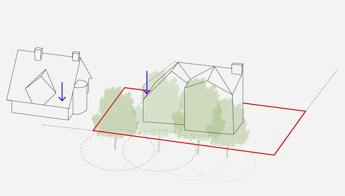 Arts and Crafts characteristics seen along the existing streetscape include low and overhanging eaves, catslide roofs, dormer windows and oversized chimneys, contributing to the avenue’s lively roofscape. Many houses feature multiple gables that face both ahead and to the side, forming asymmetric building shapes redolent of traditional rural British architecture. The design proposal seeks to continue the architectural language found along West Heath Avenue. The form of the proposal has also been influenced by the relationship with neighbouring buildings.